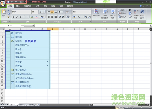 excel 2007的界面左上角圆圈部分是microsoft office按钮。红色部分是快速访问工具栏。绿色部分是功能区。蓝色部分是鼠标右键点击单元格出现的微型工具栏和快捷菜单。