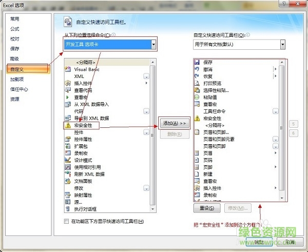 2.再出现的设置窗口中,点击左侧的“自定义”,然后点击左侧的下拉框选择“开发工具 选项卡”,之后点击“宏安全性”,再点击中间的“添加”按钮,把宏安全性添加至右侧的菜单栏,最后点击确定即可。