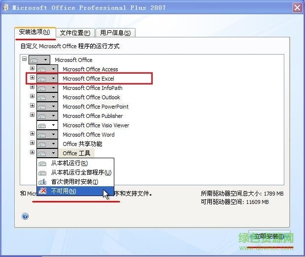 3.在“安装选项”这栏把其他office组件都去掉,只留excel2007(如图框起来的地方)。当然,如果你需要其他组件也可以一起安装,可以根据需求选择安装的组件。