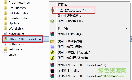 1.在文件夹中找到“Office 2010 Toolkit.exe”选择“以管理员身份运行“(如下图)