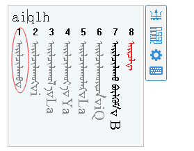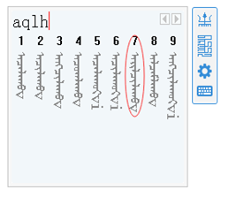 每个音节的首字母必输、其余字母可以省略。如输入蒙古文词ᠠᠶᠢᠯᠴᠢᠯᠠᠬᠤ只需要输入(aqlh),候选框中便出现该词图。但其出现位置比较靠后,在输入码a后补充i,即可将该词提升到第一个位置图。以此类似,可通过补充每个音节首字母后的其余字母,直至您需要的词出现为止或出现在候选框靠前位置。