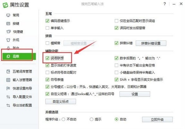 2.接着在打开的”搜狗五笔输入法设置“界面左侧的导航栏里点击”高级“;在辅助功能模块区找到”词语联想“一栏,(如下图所示)只需要在前面点击打勾,然后打勾以后,先点击”应用“再点击”确定“就可以了。
