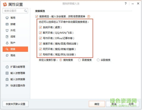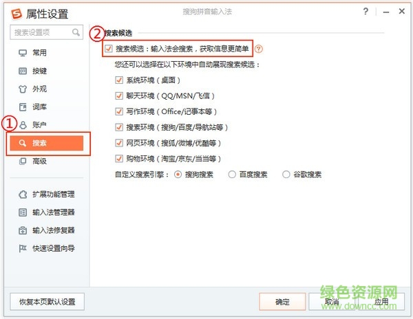 如果您希望开启或关闭搜索候选功能,按如下操作:打开输入法菜单--属性设置--搜索。 选择开启或关闭“搜索候选”即可。如果您取消了搜索候选功能勾选,输入法界面上将不再展现搜索候选下拉按钮,也将不响应↓方向键打开搜索候选结果。