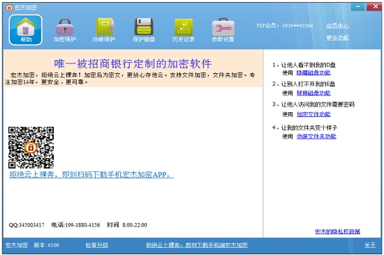 宏杰文件夹加密 一款专业的文件和文件夹加密器。永久免费、没有任何使用限制的加密软件。绝不是简单的隐藏文件夹!!!经过该软件加密的文件(夹)可以防止访问、防止删除、防止、拷贝、内容只有您知道。这款文件加密软件具有界面漂亮友好、简单易用、稳定无错、功能强大和兼容性好等特点。使用起来,只要点击需要加密对象的右键即可轻松实现。解密只要双击已 加密对象输入密码即可轻松搞定。切为真正实用、方便着想。
