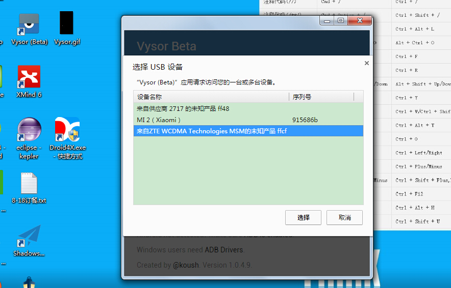装完插件,点启动应用,Vysor 就出来啦,瞅瞅它的小模样,不同平台可能会不一样(win和mac一个屌样,已连过小米2s的图)。
