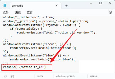 然后在renderer 文件夹内找到,preload .js 文件,使用文本打开,在最后一行粘贴下面的代码,然后保存,重启软件即可。
