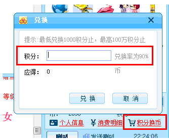 您好,您可将积分兑换为消费币,购买礼物赠与您的朋友增加感情或兑换9158公司限量礼品哦!兑换消费币您可以进入房间,在房间右下角点击“积分换币”进入进行兑换即可。如图所示: