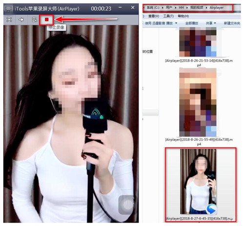 6、停止录制后,苹果录屏大师会自动打开录制好的视频的存放目录,默认目录在“此电脑”中的“我的视频”文件夹下的“Airplayer”子文件夹内,这样就表示录制完成。