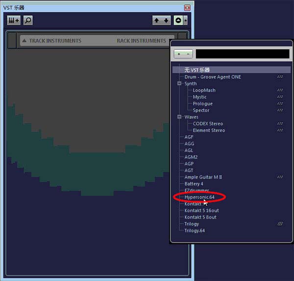 10、在VST乐器选项中,选择刚才添加的Hypersonic.64为插件,即可打开Hypersonic2了,亲测可用,并且能够保存音源
