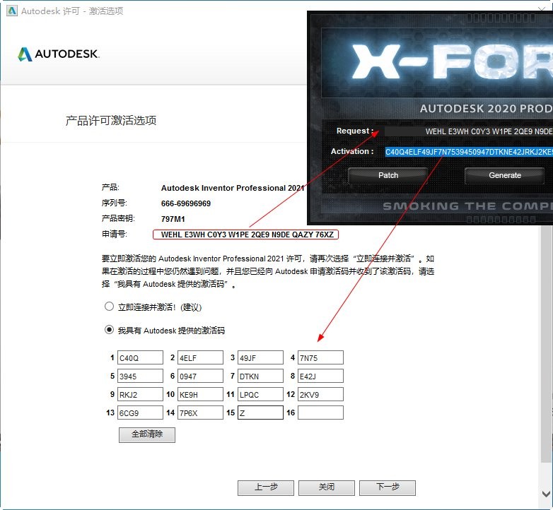 8、以管理员身份运行注册机,将申请号复制到注册机,点击pathc,点击generate,生成激活码,将激活码复制到软件激活页面,点击下一步;