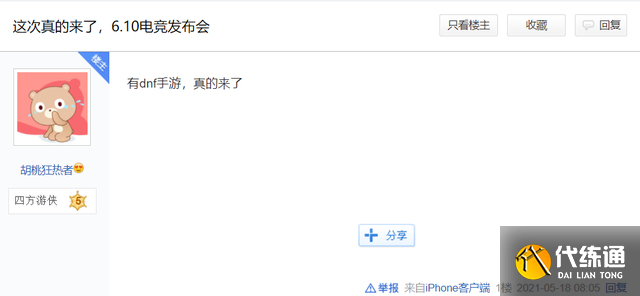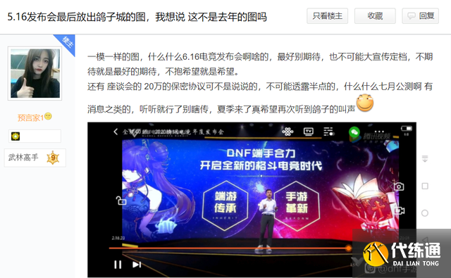 但就在今日,事情却迎来了转机,有网友爆料DNF手游或将在7月份开启测试,而腾讯也将在下个月的电竞发布会上正式官宣,一时间这一消息令玩家议论纷纷,但由于没有可信的官方发文,多数网友还是持观望的态度。