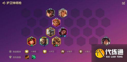 阵容主要肉坦为主,7神将羁绊能让所有神将棋子增加75双抗,哪怕华剑战姬、天罚弩神的物理与魔法减伤也能达到50%左右,阵容坦度极高;另一方面7神将棋子每次普攻明珠均能为阵容所有棋子治疗20生命值,阵容续航能力极强。