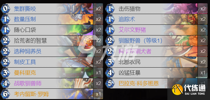在野猪猎的起手留牌方面,主要是以集群撕咬,数量压制,随心口袋,拾荒者的智慧,选种饲养员,制皮工具,曼科里克,击伤猎物,追踪术,艾尔文野猪,驯服野兽(等级1),科-卡尔驯犬者,北郡农民,凶猛狂暴等低费卡牌为主。