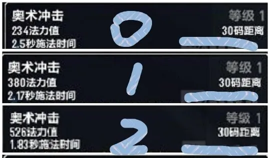 这是来自于PTR的数据,可以看到奥术冲击在2T5的加持下从零到3段的耗蓝分别为234点、380点、526点和673点。