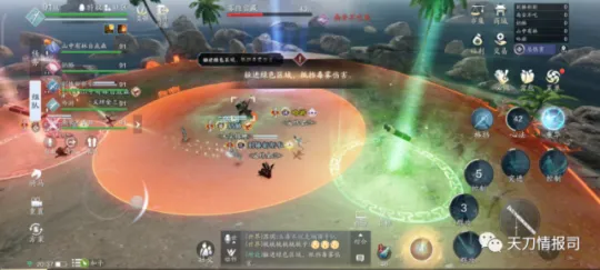 当然,这招也不难破解。扇形AOE可以直接翻滚躲避。而毒雾则需要在“授命·化毒”区域(绿圈)中才能免受伤害。