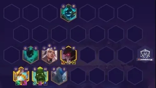 阵容英雄:战争之影—赫卡里姆(2)、魂锁典狱长—锤石(2)、钢铁少女—芮尔(4)、北地之怒—瑟庄妮(2)、虚空之眼—维克兹(4)、复仇焰魂—布兰德(2)、深海泰坦—诺提勒斯(2)